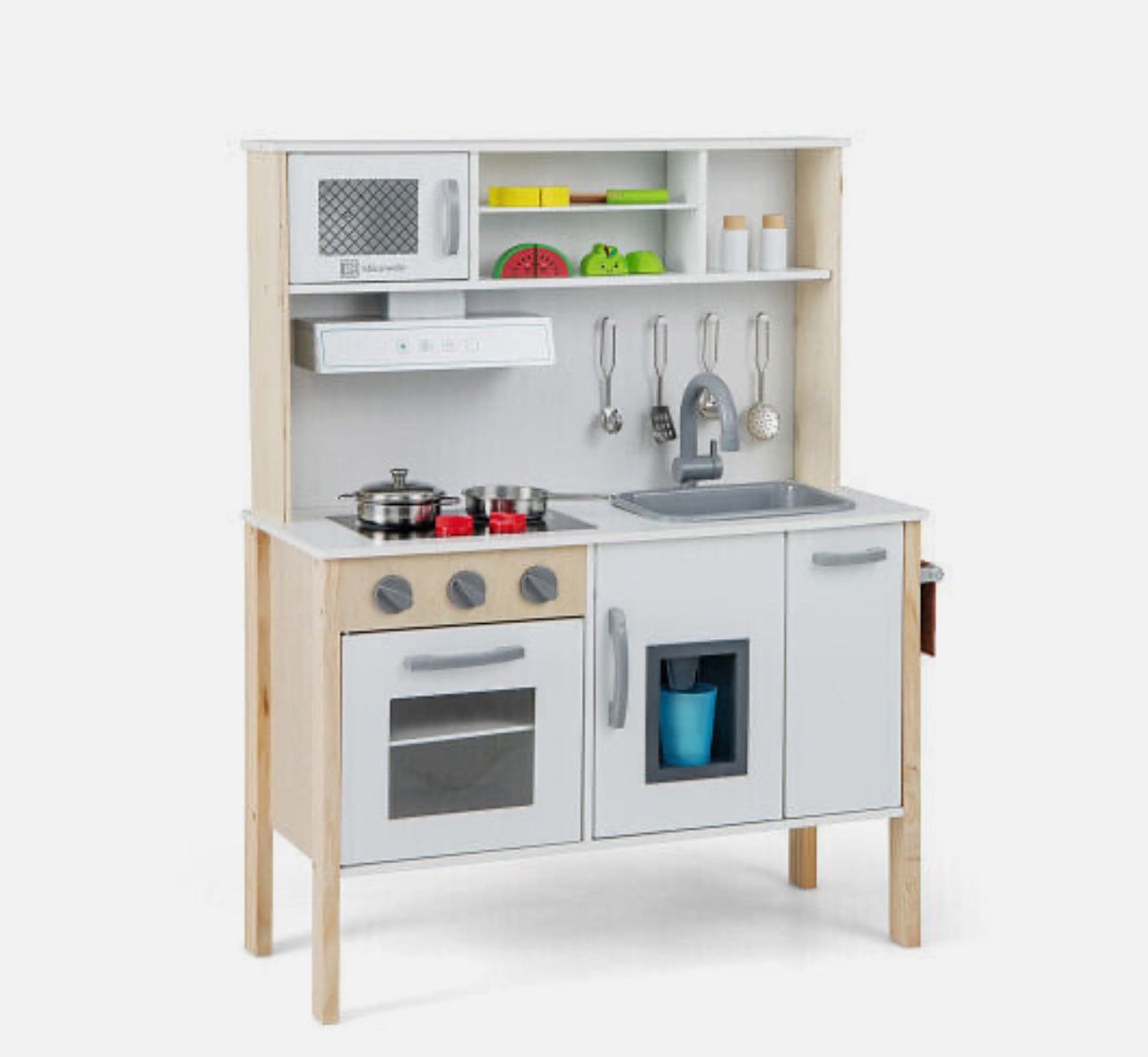 Tp10125wh B06 Specifications: Color WhiteMaterials MDF PlywoodProduct Dimension 28" x 12" x 35.5"Counter Height 19"Net Weight 22 lbsRecommended Ages 3-6 Years Old -High-grade and BPA-free materials for durability and sturdiness -Microwave range hood and oven mimic a real kitchen -Put the ice cubes in the ice maker and get them with a simple press -Removable sink and pretend gas stoves for an immersive experience -Rotatable faucet switch and knobs with sound add more fun -Equipped cooking necessities and toy fruits for convenient use -Perfect storage solution holds kid's belongings for easy access -Anti-toppling device and safe round corners for security -Thoughtful hooking and towel rack for organized storage -Convenient handles for easy opening of the doors -Great gift for 3-6-year-old toddlers and improve parent-child interaction -Beneficial to kids' hands-on ability imagination creativity and social skills -ASTM and CPSIA certifications for enhanced reliability
