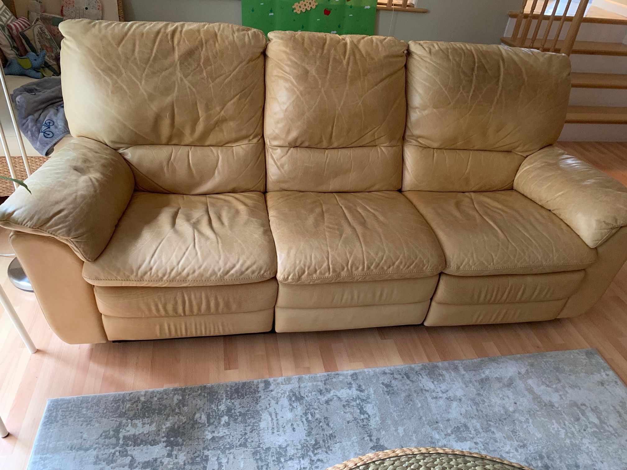 I believe brand is natuzzi, Italy. 84 (left to right) x 34 deep (seat to back)x 36 H (floor to head rest) Pick up in Belmont heights