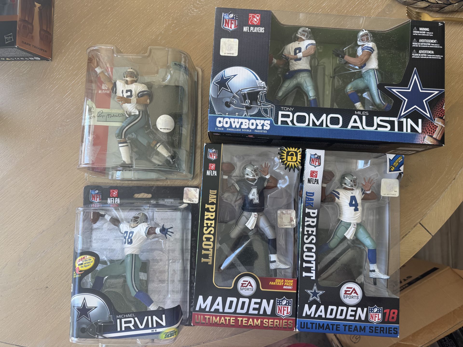 New in box Dallas Cowboys Mcfarlane Sportspicks Sports Figures. Michael Irvin $25 Roger Staubach $25 Dak Prescott Blue Jersey $20 Dak Prescott White Jersey $15 Tony Romo Miles Austin 2 Pack $20 $100 for everything Instant Cowboy Collection Check out my other posts for many sports figures. Mcfarlane Starting Lineup Bobblehead and more.