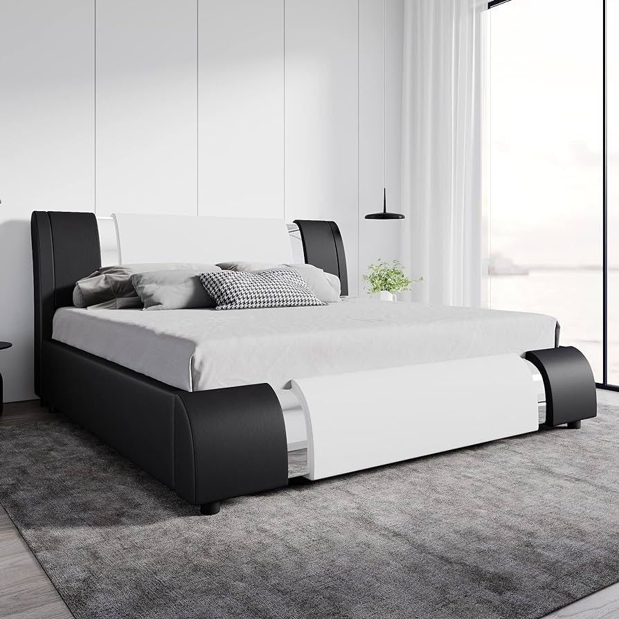 O455 Modern Faux Leather King Bed Frame with Adjustable Headboard and Iron Accents, Deluxe Upholstered Platform Bed with Solid Wooden Slats Support - White + Black Top highlights Size King Material Steel Product Dimensions 93.7"L x 79.7"W x 35.4"H Style Modern Special Feature Adjustable Headboard Color White With Black Sides STRONGER THICKER BASES: The base of the bed is made with wooden panels and help extend the life of your mattress and foundation. The 2 inch wide and 11 inch high side panels make the platform bed thicker and more durable ALL-ROUND DESIGN: With typical black and white color, this streamlined bed frame makes a stunningly chic addition to your bedroom. This round surface with no sharp edges design can prevent unnecessary accidents for your beloved ones ERGONOMIC HEADBOARD: The curved backrest can fit your waist better, which provides comfortable support for you to lean on. The headboard can be adjusted to fit different mattress thicknesses. 10-12'' mattress recommended SUNKEN MATTRESS FRAME: The bed frame adopts a sunken mattress design and isometric slats base, which can be firmly and stably clung to your mattress without sliding and shifting. It can support a maximum weight capacity of 800 lbs NO BOX SPRING NEEDED: Solid wood foundations perfectly support and extend the life of your memory foam or mattresses without a box spring. Wooden slats are spaced 4 inches apart to prevent structural denting and sagging 1035658-9