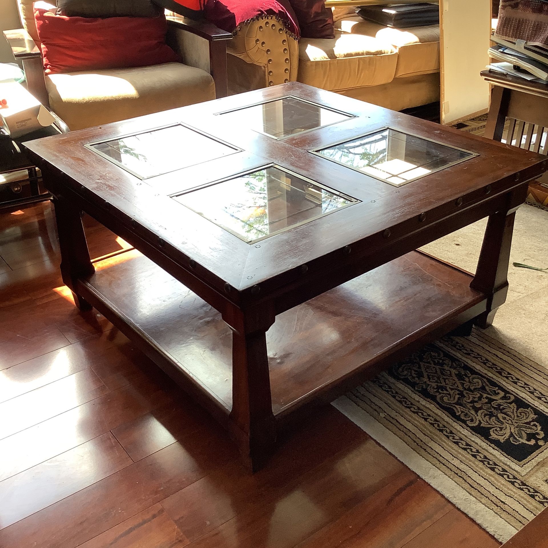 Beautiful solid wood with glass pieces on top 38in x38 in is wide Height :20 in