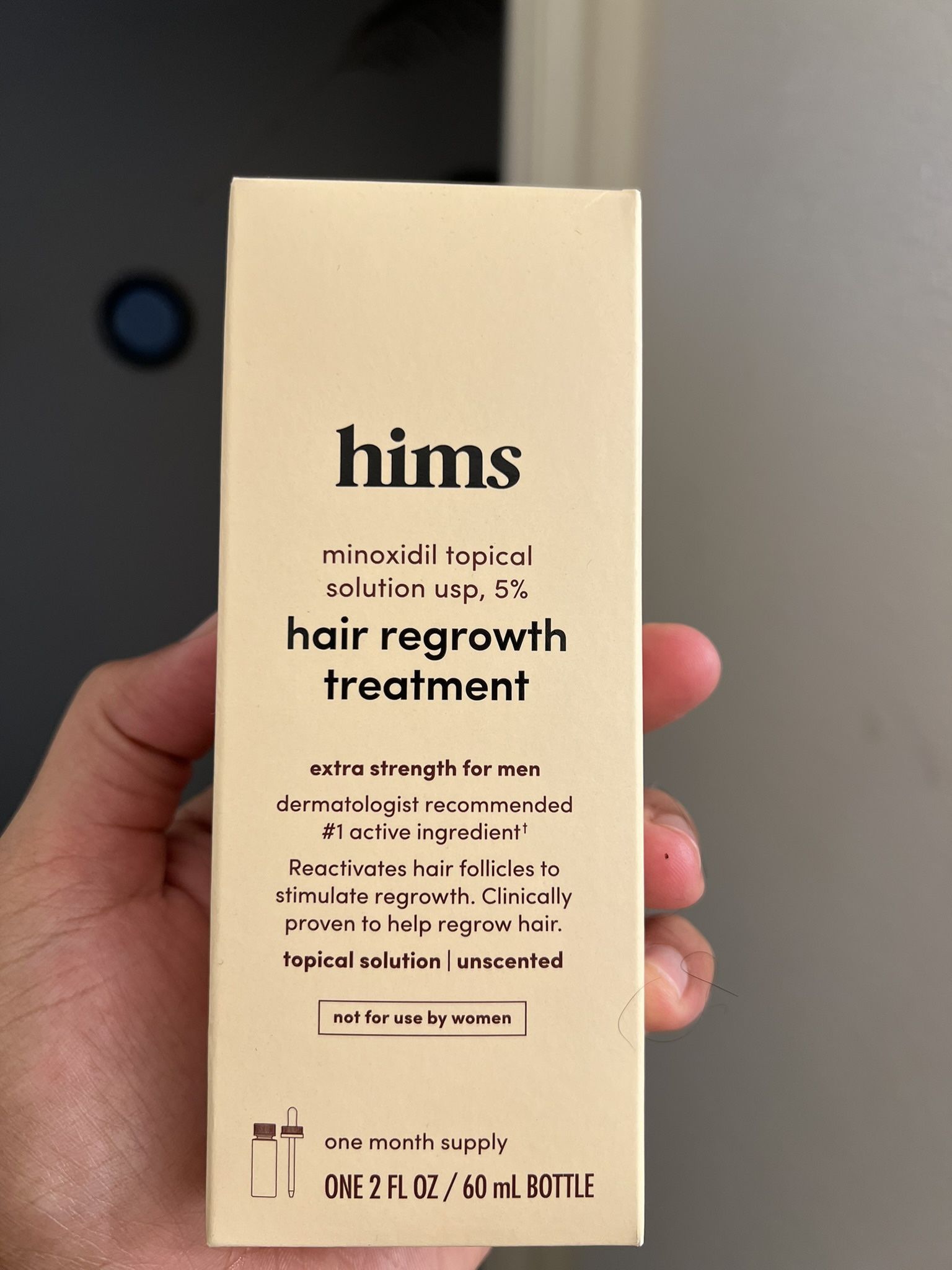 Hi there — I’m selling a brand-new, unopened box of hims Minoxidil Topical Solution USP 5% for men (2 fl oz / 60 mL). • Extra-strength formula, dermatologist-recommended. • Valid expiry: October 2026. • One-month supply size. • Never opened or used; still in factory-sealed packaging. Important: This product is intended for men (as noted on the packaging) and must be used as directed. I’m reselling as personal item only. Make sure you’re aware of usage instructions and any contraindications.