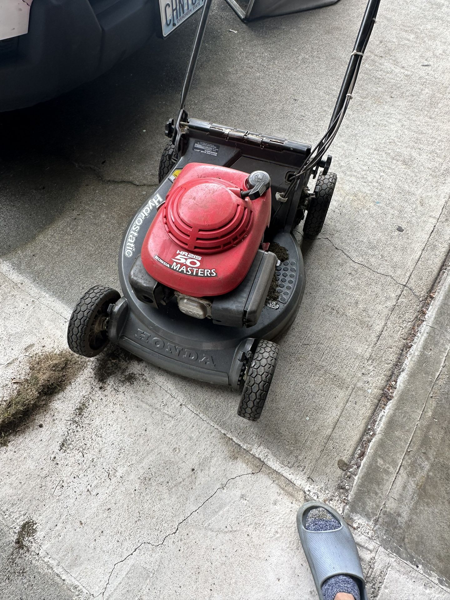 Honda masters HR215 Hydrostatic transmission Blade clutch control Bag included . Unfortunately the bottom of the deck by the rear bag & transmission . Is missing a piece of the aluminum deck . “Dang rock” It’s an easy fix just don’t wanna mess with it . She operates like she suppose to . But leaves a trail of grass clippings .weld a piece of thin aluminum & your in business $180 FRM Hrc216 aerator thatcher lawn lawnmower homeowner edger detahtcher Tanaka commercial