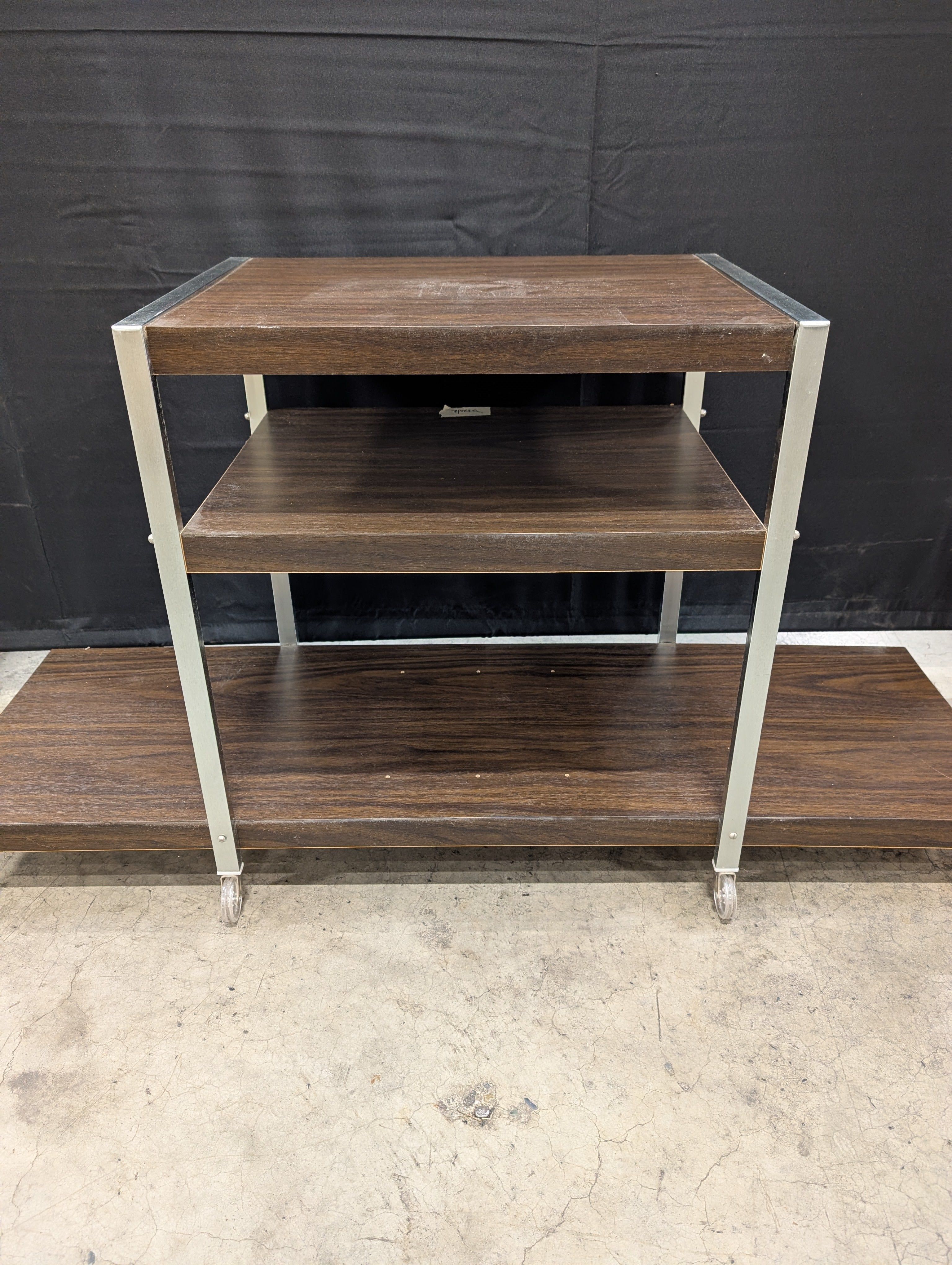 This three-tiered rolling cart features a rectangular design. It is constructed with dark wood-look laminate shelves. The unit includes a silver-toned metal frame and casters for mobility.
