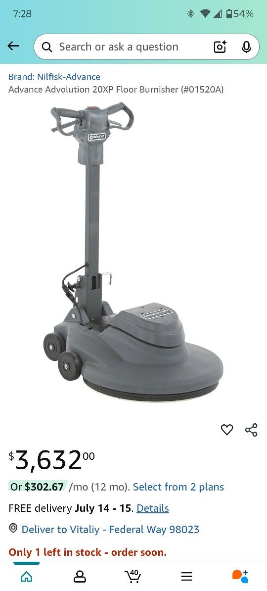 Advance ultra 20 floor burnisher by nilfisk-advance Self-adjusted pressure to maximize performance Works good, saves a lot of time on polishing floors compared to other polishers with the dust collector Retails New $3,000 +