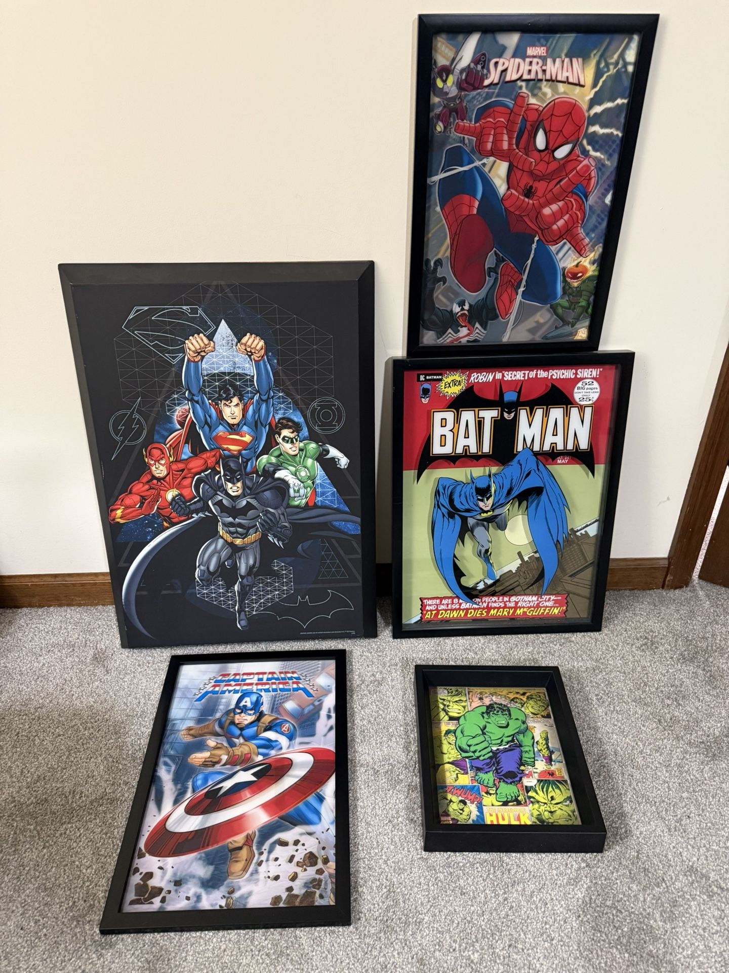 Set a five Marvel wall hanging art pieces. The Spider-Man, Hulk, Hogan, and Captain America are 3-D hologram