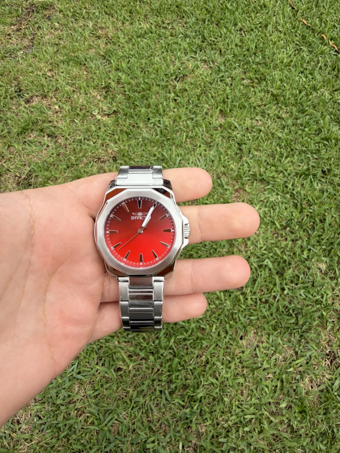 Invicta with red dial with stainless steel bracelet is a 42mm Brings box Brand new.