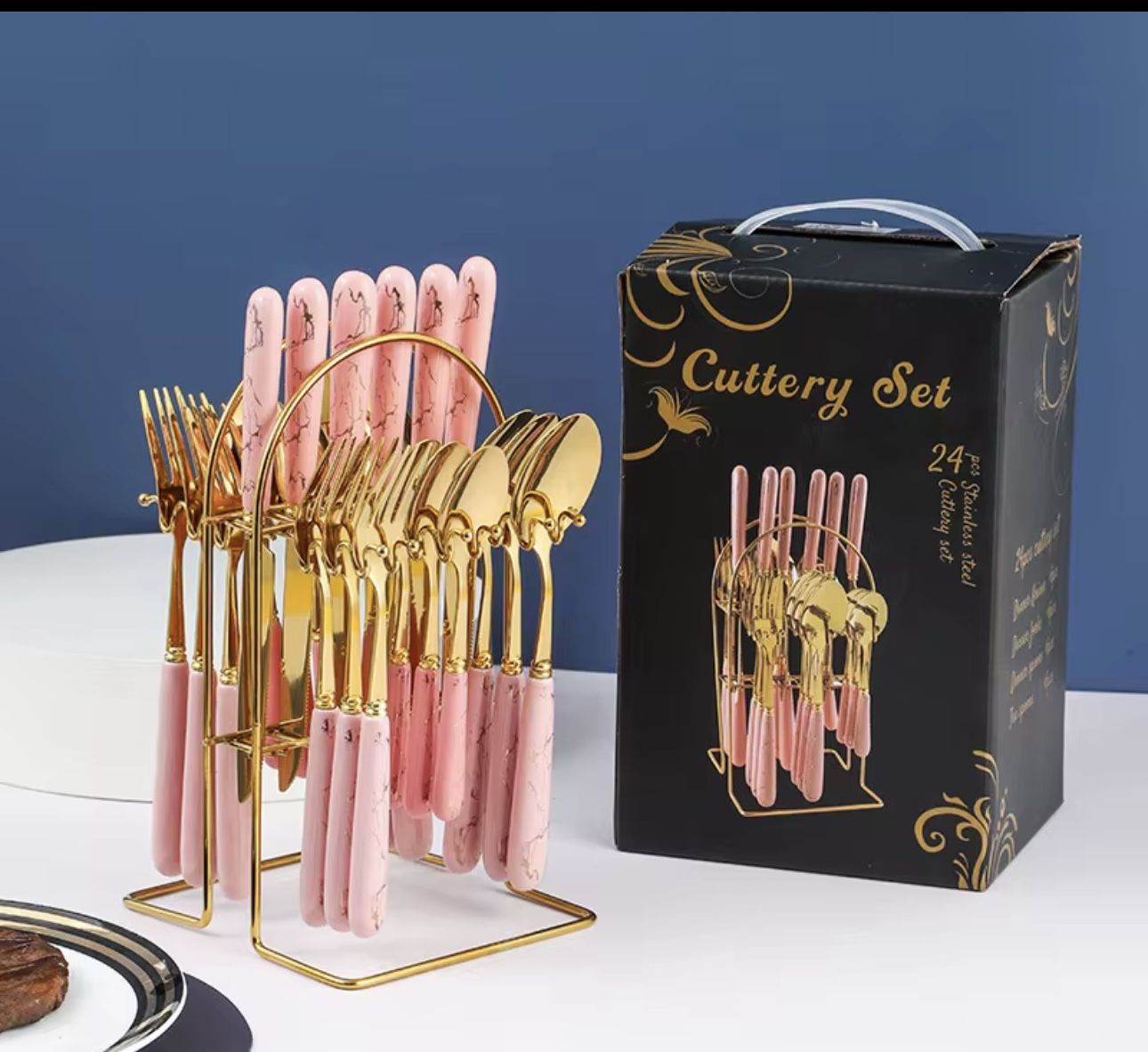 Facega 24 pst spoons and forks sets complete cutlery sets spoon and forks sets different colors. Green, white, pink, black.