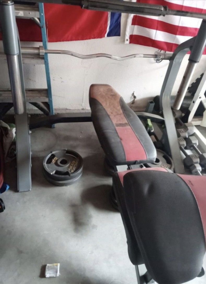 Everything Weights gym bench two bars 4.. 25lbs 10.. 10lbs 4.. 5lbs plates squat rack