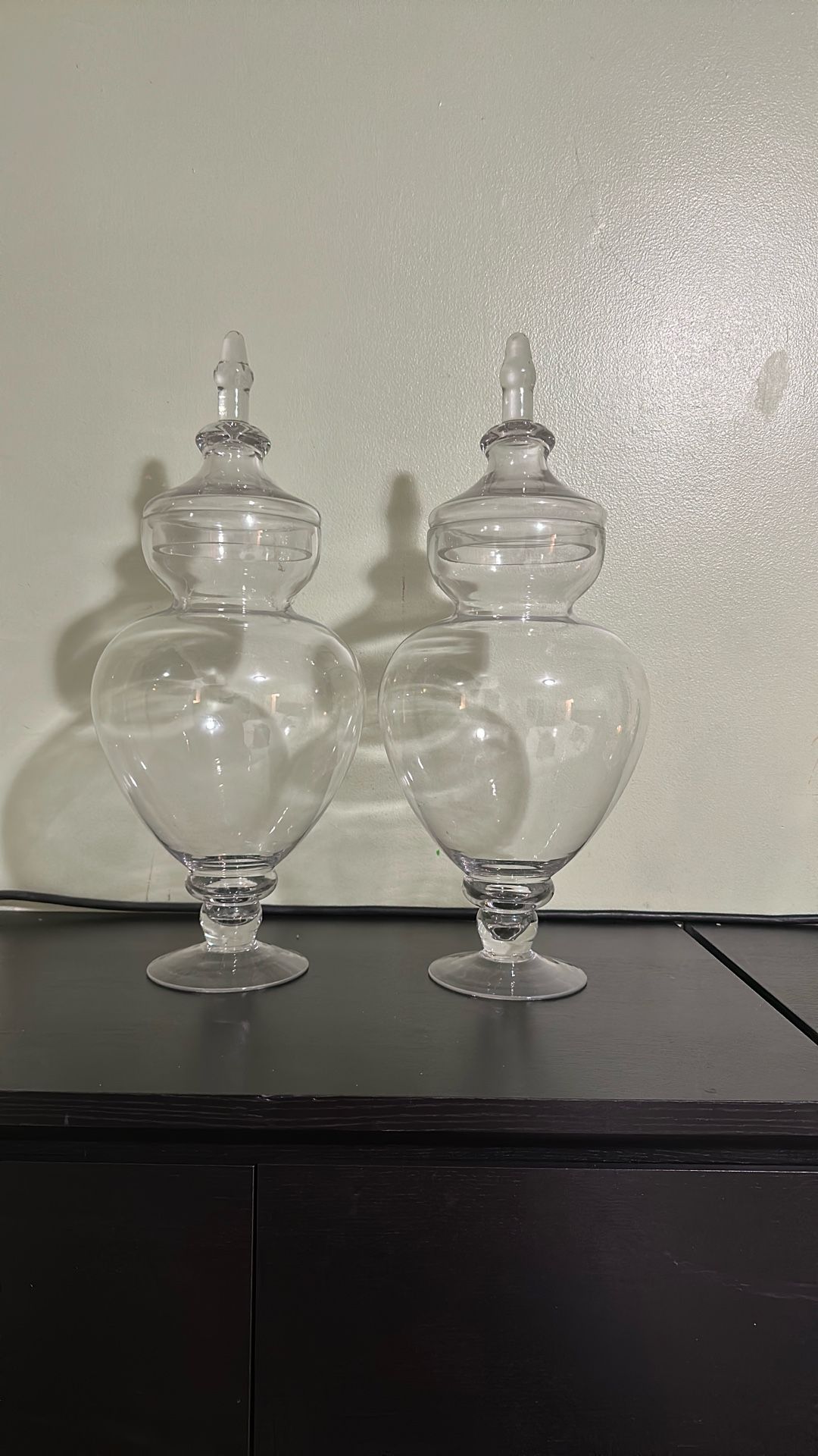 Glass candy jars or can be used for anything. No cracks. They stand 23 inches tall and the widest part is 9 inches. Very fancy for a candy table. Both for $40