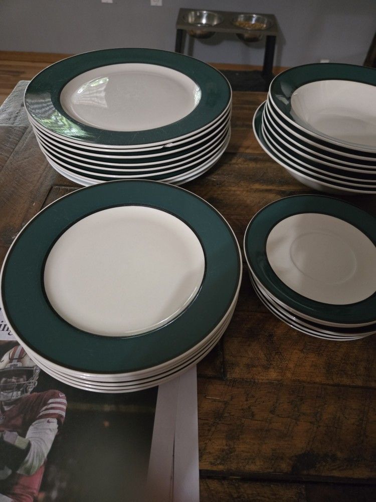 7 dinner plates, 6 dessert plates, 7 saucer plates, 7 bowls and 5 coffee cups. A few small scratches, but overall good shape.