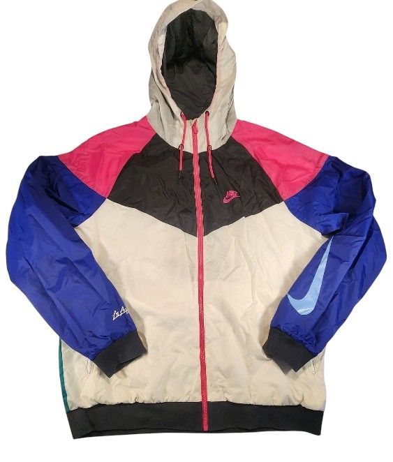 NIKE los angeles lab RETRO DISCO 90S HOODED WOMAN JACKET WINDBREAKER SIZE XL *Sleeve is 23 inch * Shoulder is 26 inch *Chest flat is 26 inch *Length from back 29 inch * Colors are off white, green, blue , yellow, and pink * nonRemovable hood . * Zipper closure * Back vent * Elastic band at the waist * One sleeve has "los angeles" printed near the hem *Item will be nicely packed and shipped the same or next business day of cleared payment * We do not used stock photo . 4503-21 Sahara and sloan lane for local pickup or shipping is available