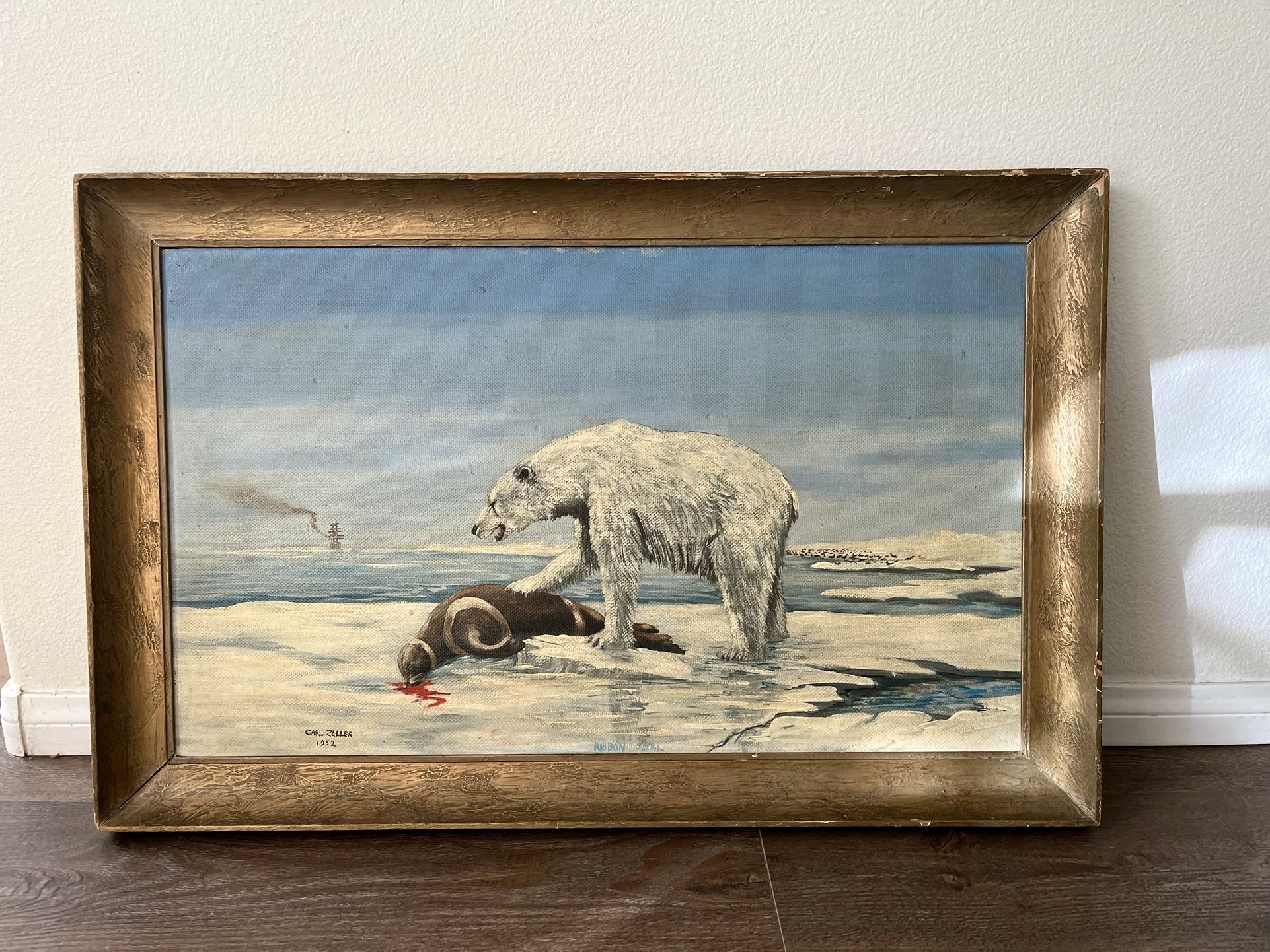 Vintage Oil On A Board Ribbon Seal by Care Zeller Art 1952 Framed 22/34 Inch