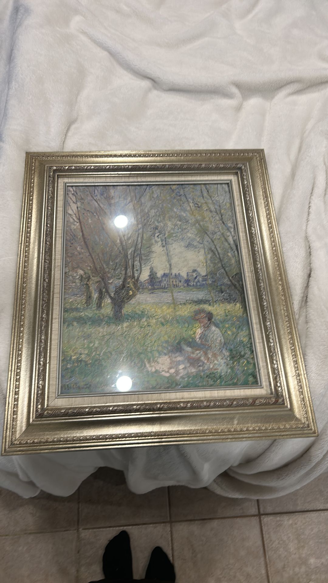 This item is a framed art print reproduction of Claude Monet's 1880 impressionist painting, "Woman Seated under the Willows"