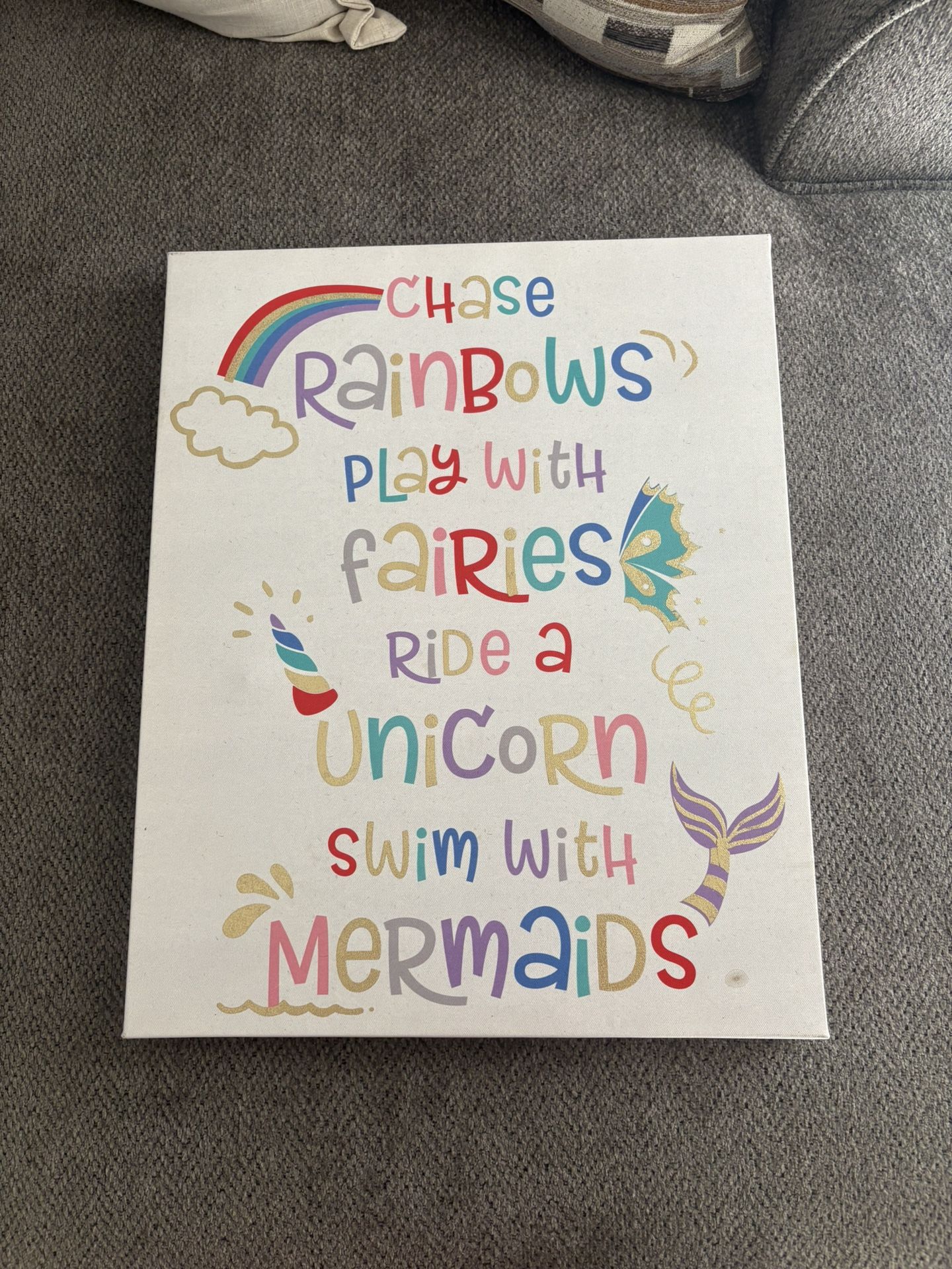 Vibrant wall art with rainbow, fairies, unicorn, and mermaids. Perfect for adding a splash of color to any room.
