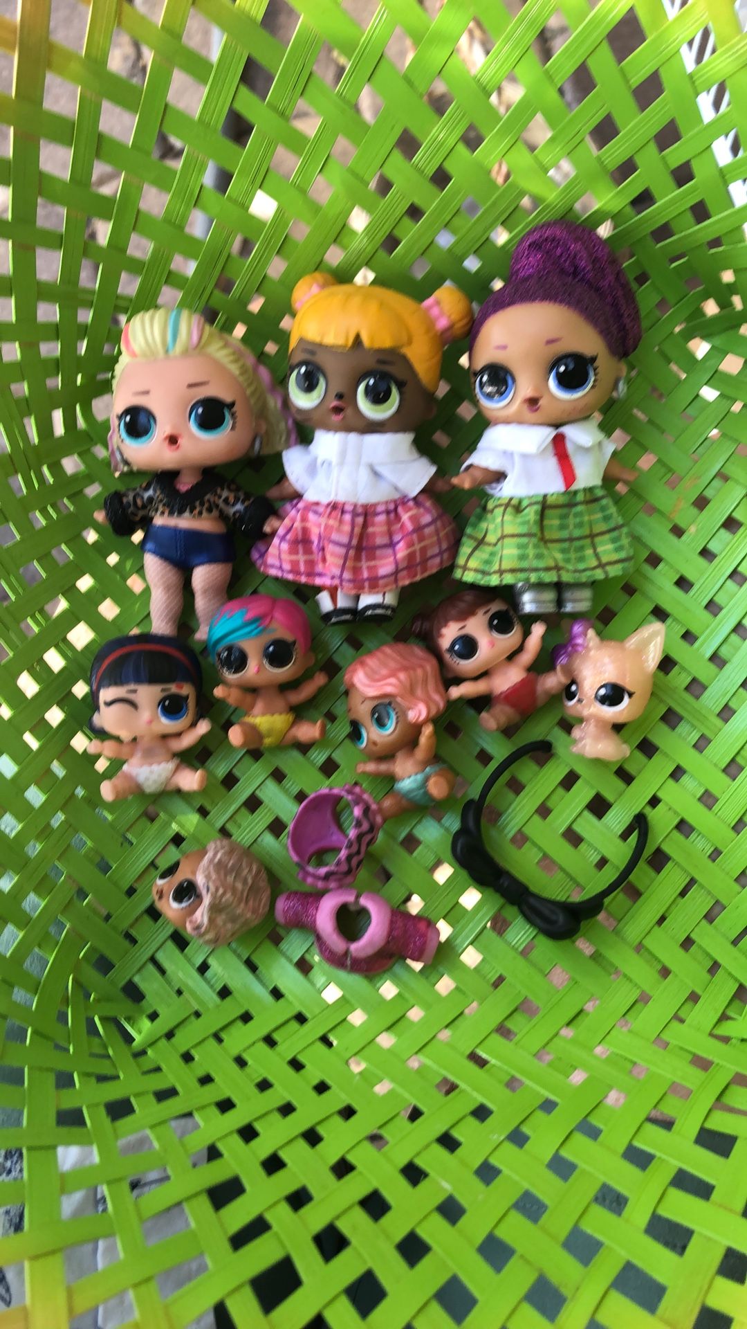 3 dolls 4 tiny dolls outfits missing on small ones. Two larger ones complete kitty a n extra mics included
