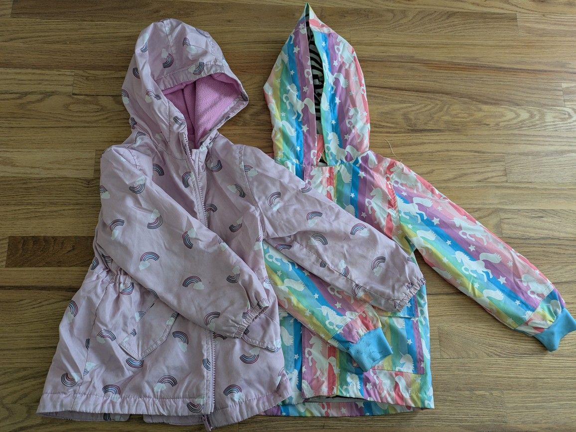 4T jackets. The rainbow jacket is a good fall jacket, rain resistant. The unicorn jacket is waterproof.