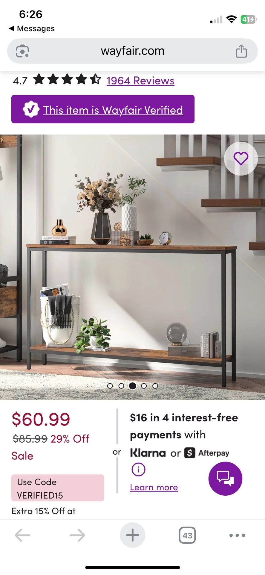 his modern console table blends sleek industrial flair with smart storage to elevate any entryway or living area. Crafted with an engineered‑wood top and lower shelf supported by a minimalist iron frame, it provides durable display and organization space in a compact footprint. The clean, open design makes decorating easy and clutter‑free. Use it to hold baskets, trays, framed photos, or everyday grab‑and‑go essentials. Plus, its streamlined silhouette won’t overwhelm tight spaces and pairs well with a variety of decor styles. Features Engineered wood top and shelf for versatile storage and display Slim iron frame adds modern industrial flair Compact footprint fits behind sofas, in entryways or under windows