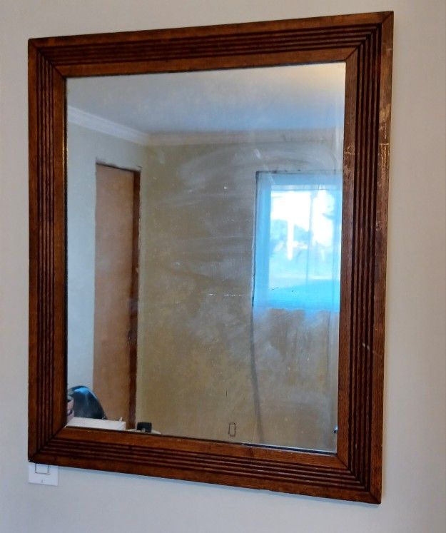 Antique oak framed mirror with the measurements of 27" wide x 33" high. The price is $125.