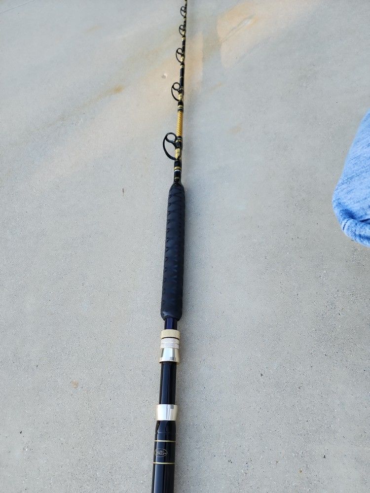 United Composites deep sea fishing rod. Two piece 5'11" medium heavy rod. Black fuji guides, black roller tiptop. It is a custom rod. With a chaos. 2 piece handle that is black and gold in color.