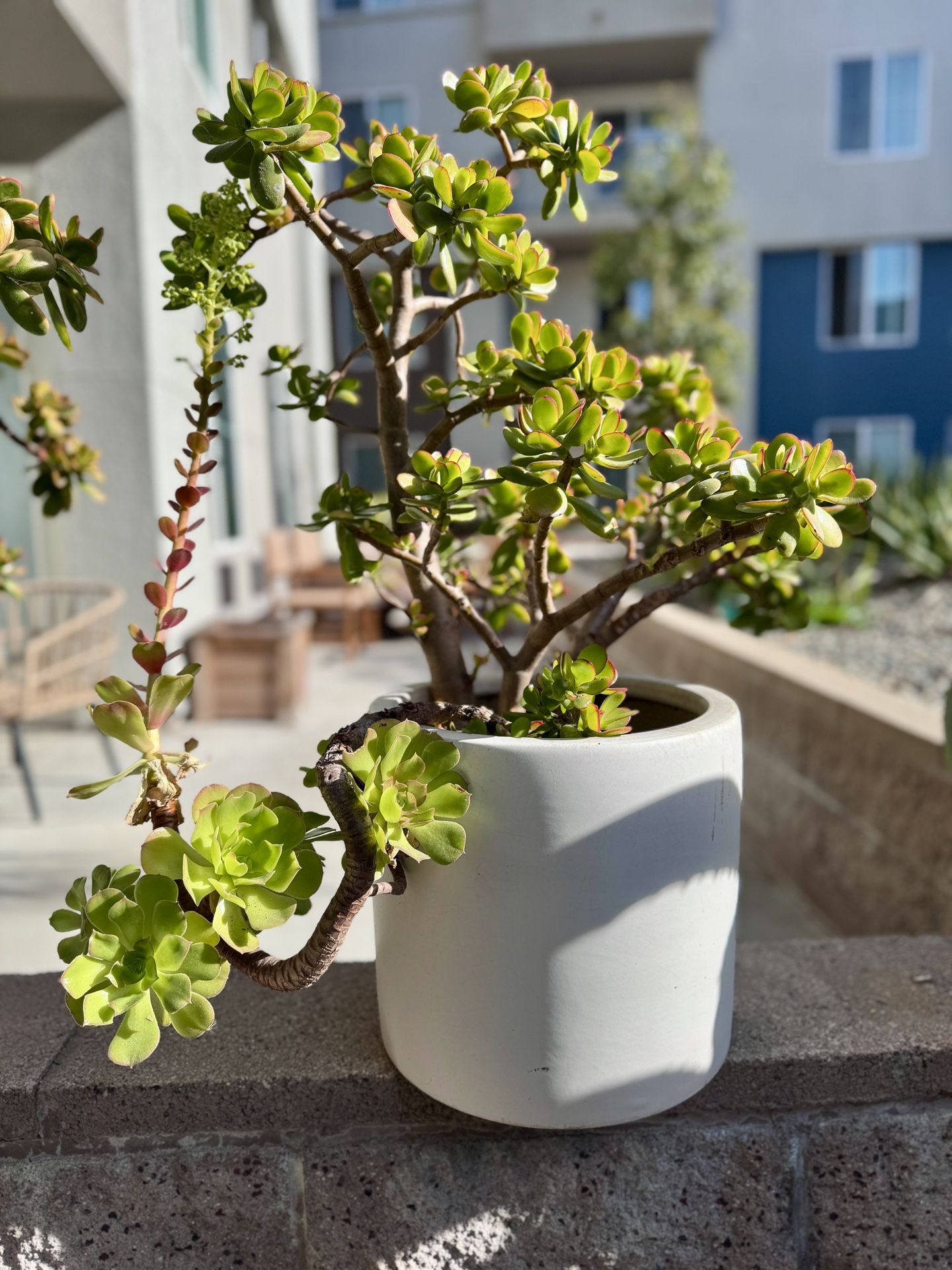 2’-6” tall, 2’-8” wide. 12” white ceramic pot.