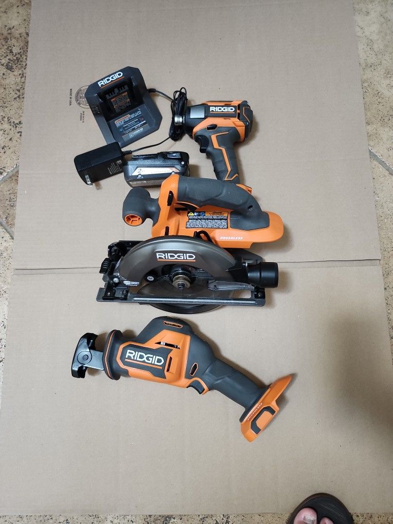 Selling set of Rigid subcompact Brushless 18v tools. Like new condition. 6 1/2 in. Circular saw. One handed Sawzall and 1/4 in 3 speed impact. Circular saw comes with blade. One charger and one 2.0 ah battery.