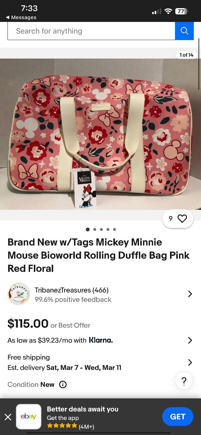 New Mickey Minnie Mouse Bioworld Rolling Duffle Bag Pink Red Floral