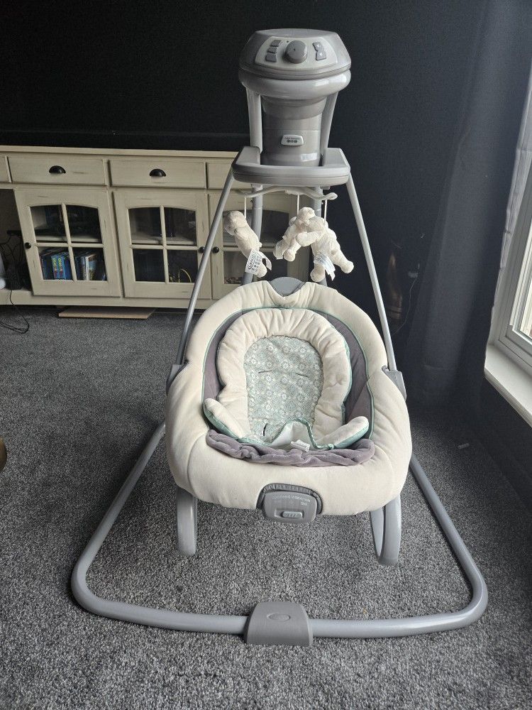 Graco Portable Baby Swing and Bouncer in gently used condition. Features a multi-directional bouncer seat with multiple swing settings. Includes safety straps and power adapter.