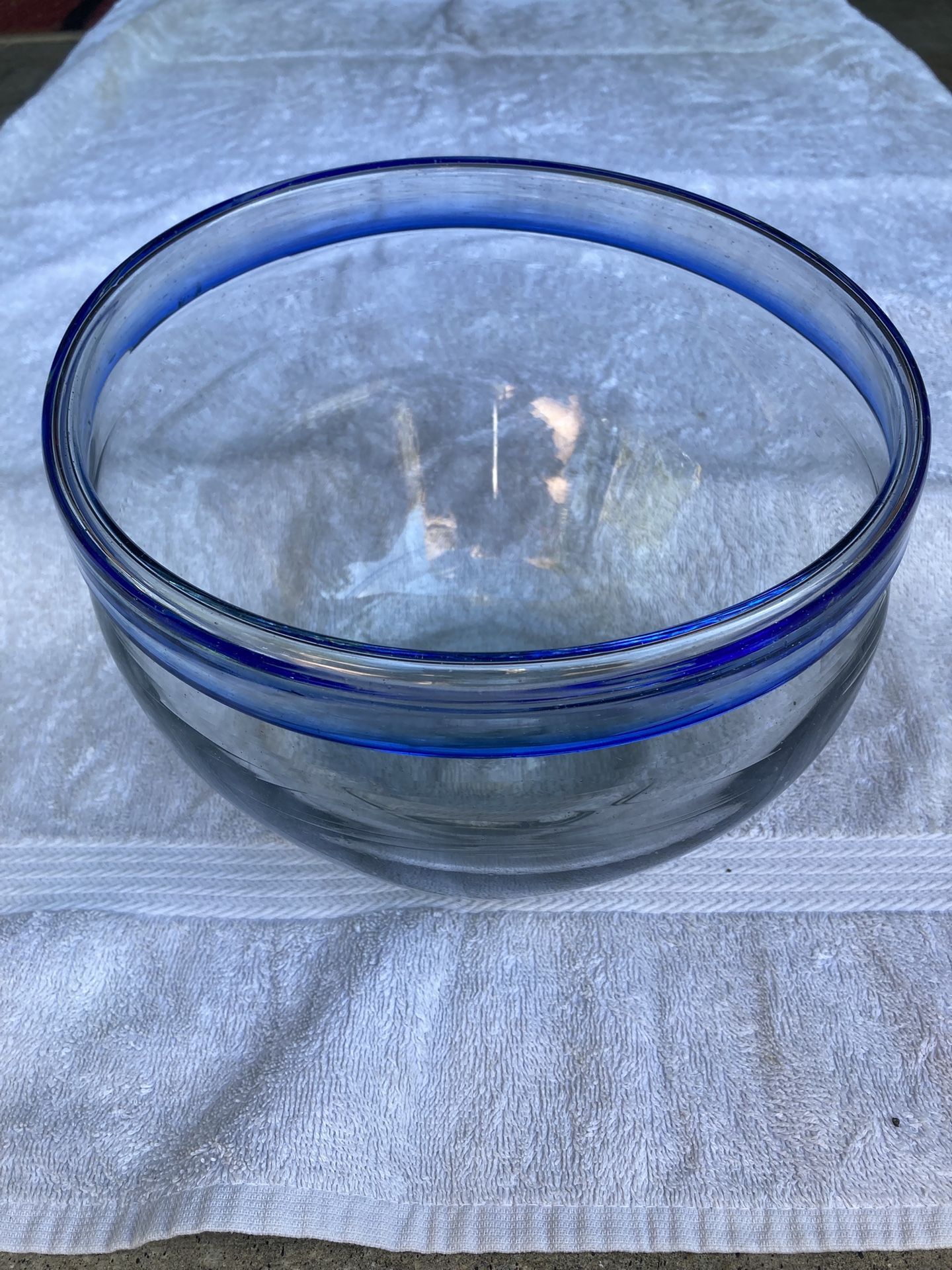 Serving bowl or decorative I.e floating flowers and candles. Over 37 years old; it was a wedding present in Maine. Simple design yet striking and high lighting the craftsmanship of glass making. Hand blown in Mexico.