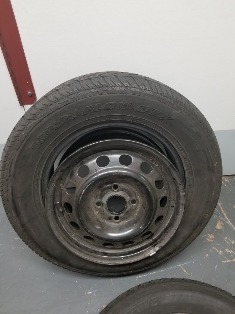 1 Observe Studless tire 195/60R15 1 Aqua Flow / Grand Grip IT 205/65R15 Both used, both come with the rim. Fair tread left