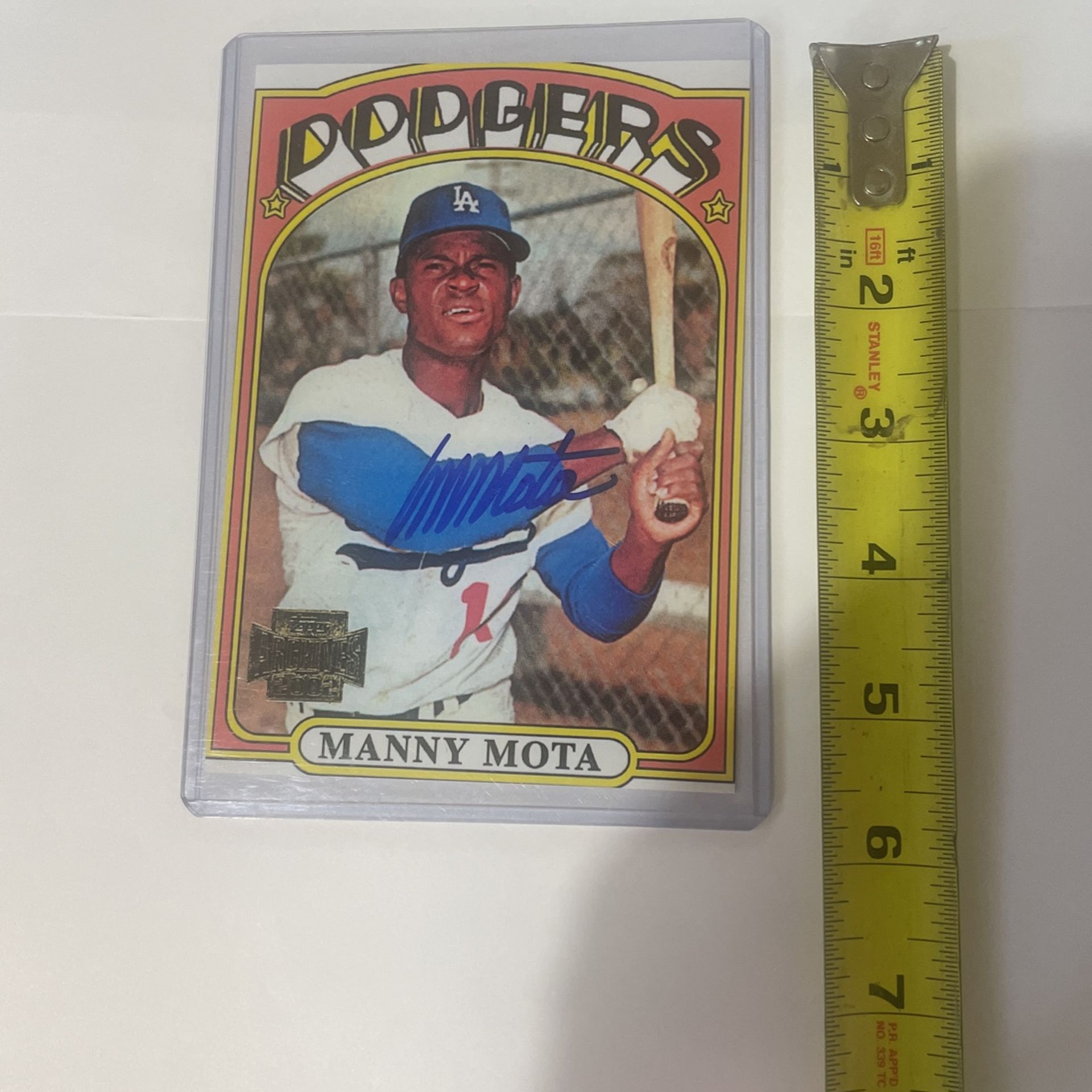 LA Dodgers oversized signed sports card. 4 inches by 5 1/2 inches. Signed by Manny Mota. It’s in a protective plastic sleeve (top loader)