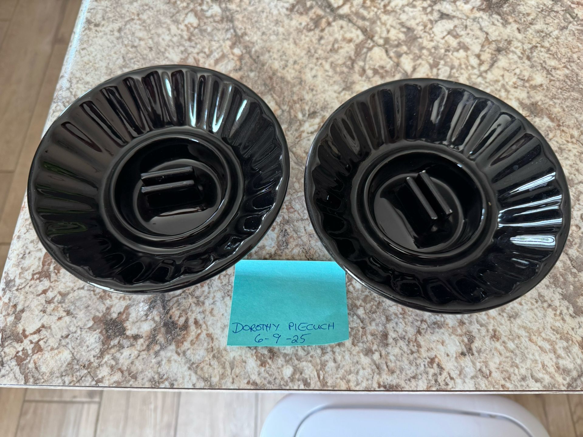 2 black vintage Hall ashtrays perfect for the collector! Circa 1920’s to 1950’s. Made of ceramic. 6.25” diameter, 2.25” height. Had a center holder for book of matches. Use as an ashtray or candy dish or trinket dish. Great condition! Art deco round, ribbed ashtray. No defects. As is, no returns. Shipping available or pick up in or near New Lenox, IL