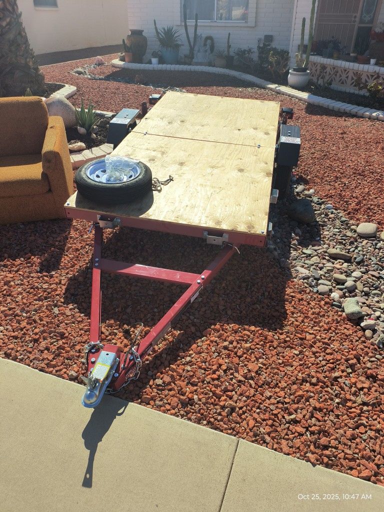 This 5x8 trailer folds so you can put it within 2' of the wall. I have sides for it, a title and a forever license plate. This is perfect for hauling your golf cart, riding lawnmower, kayak, rowboat or camping/fishing equipment.