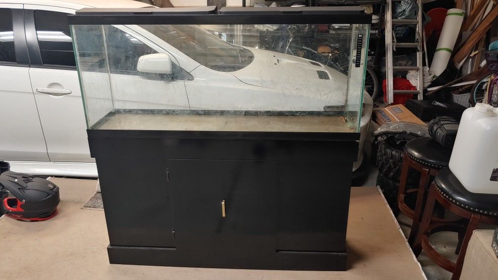 55 gallon fish tank with lids and stand. One panel has a single crack.