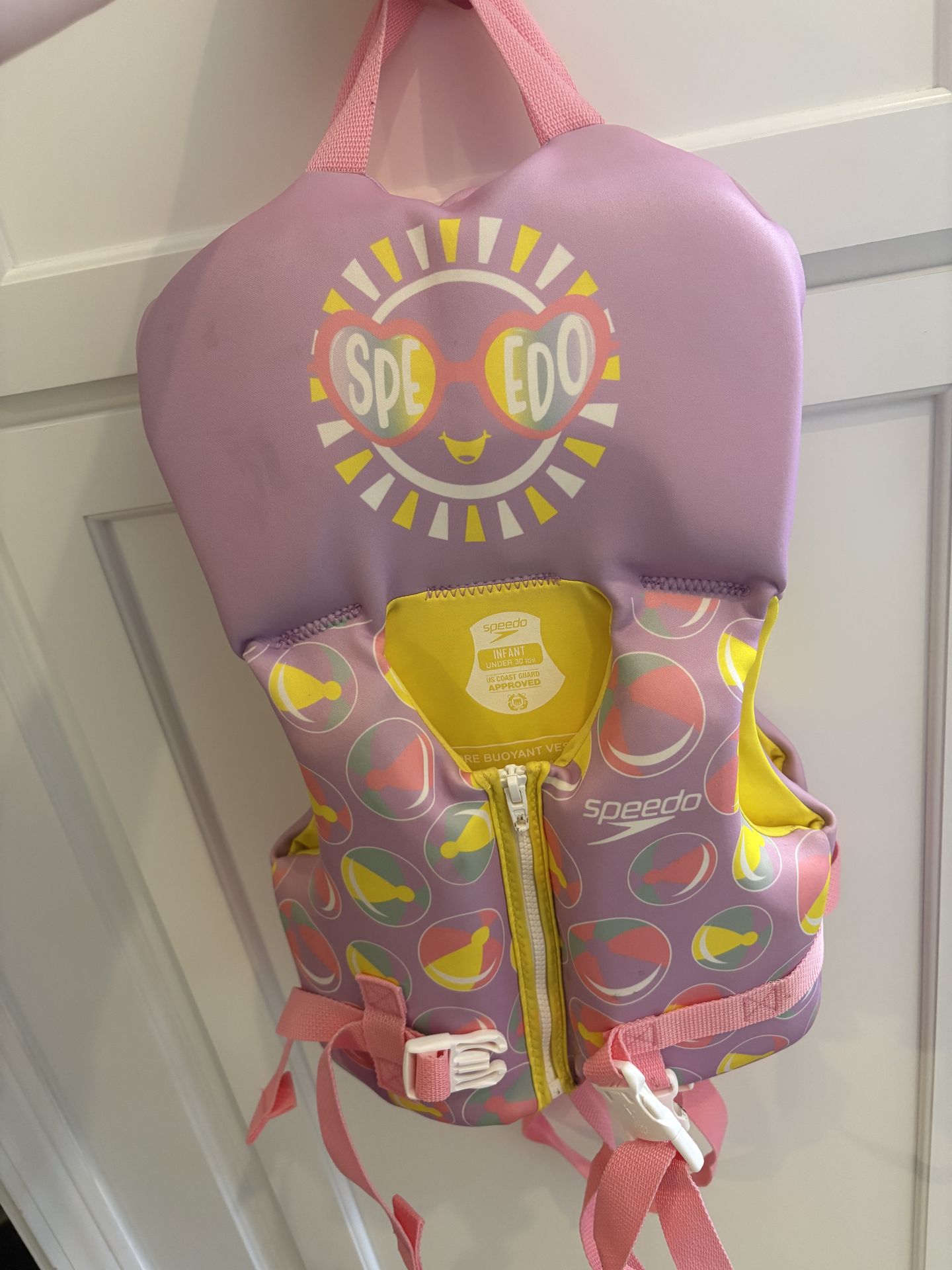 2 infant Speedo life jackets. Gently Used for 1 summer. Light Pink and Purple and yellow design. $15 for both!