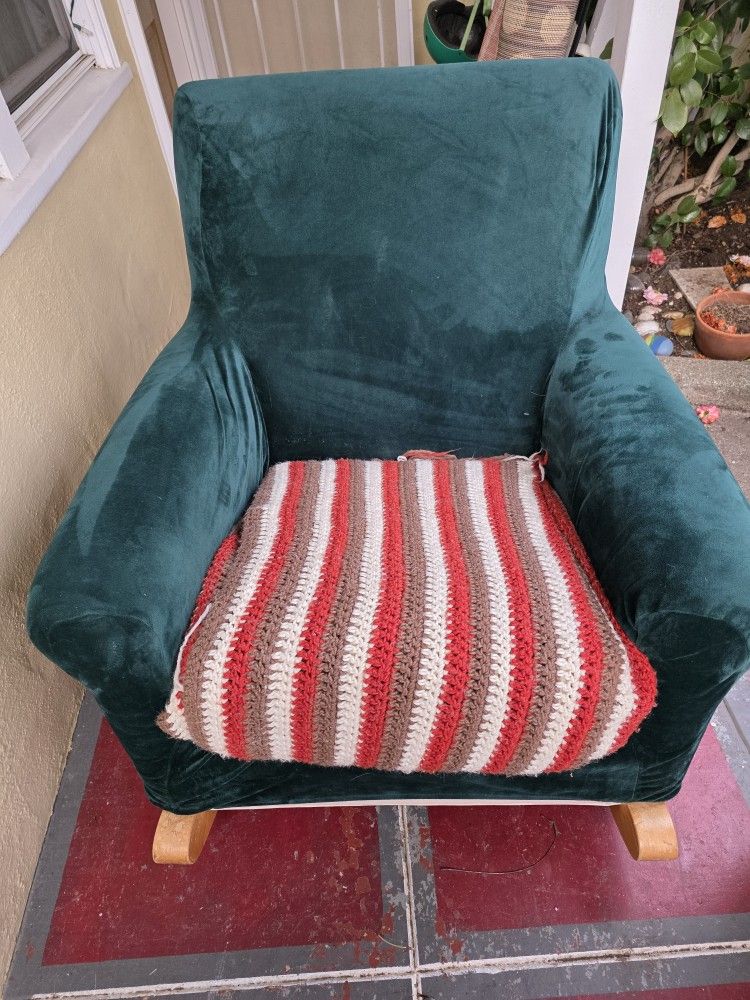 Sturdy, comfy, rocking chair. Seat cushion probably needs new cover - cheap from Amazon - or you can leave it with the blanket line we have in the pic.