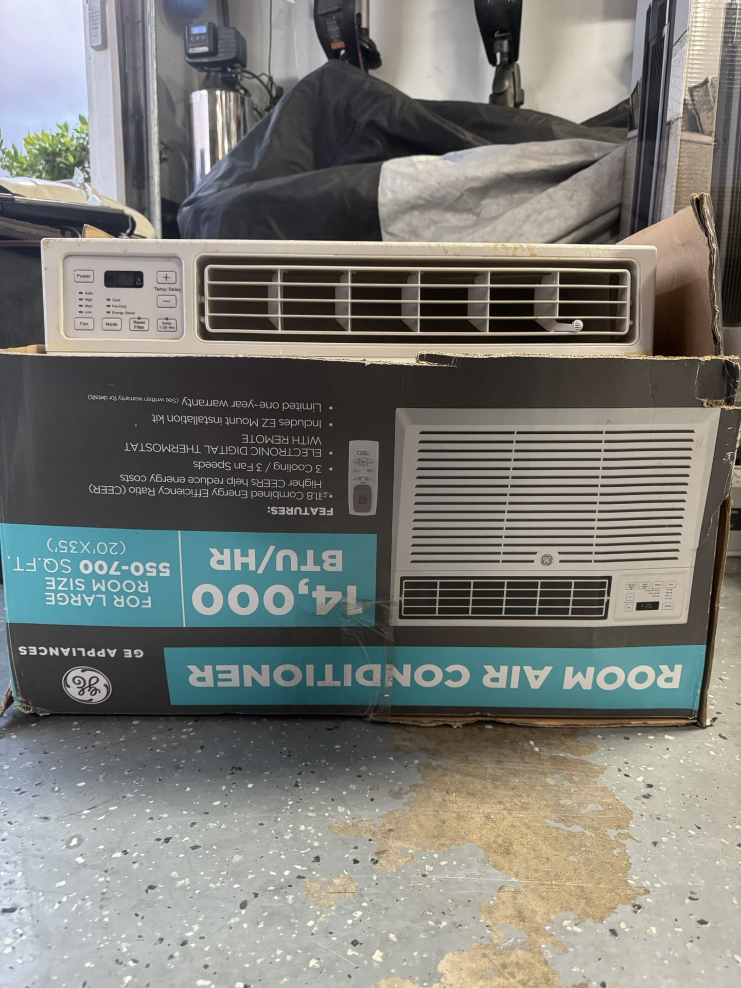 Big heavy unit that will cool down a big place. Not a tiny window unit but a big heavy full size. Works great
