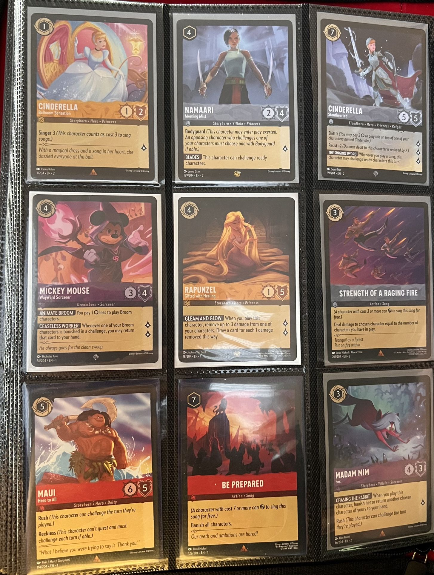 All are Mint or NM. They have never been played with and have always remained in a sleeve. Below are individual prices. Or I can also do 70 for all the cards. All are normal print, no cold foils. Rapunzel - 37 Maui - 14 Be Prepared - 9 Madam Mim (fox) - 4 Strength of a Raging Fire - 4 Cinderella (ballroom sensation) - 2 Namaari - 1 Cinderella (stouthearted) - 1 Mickey Mouse - 1