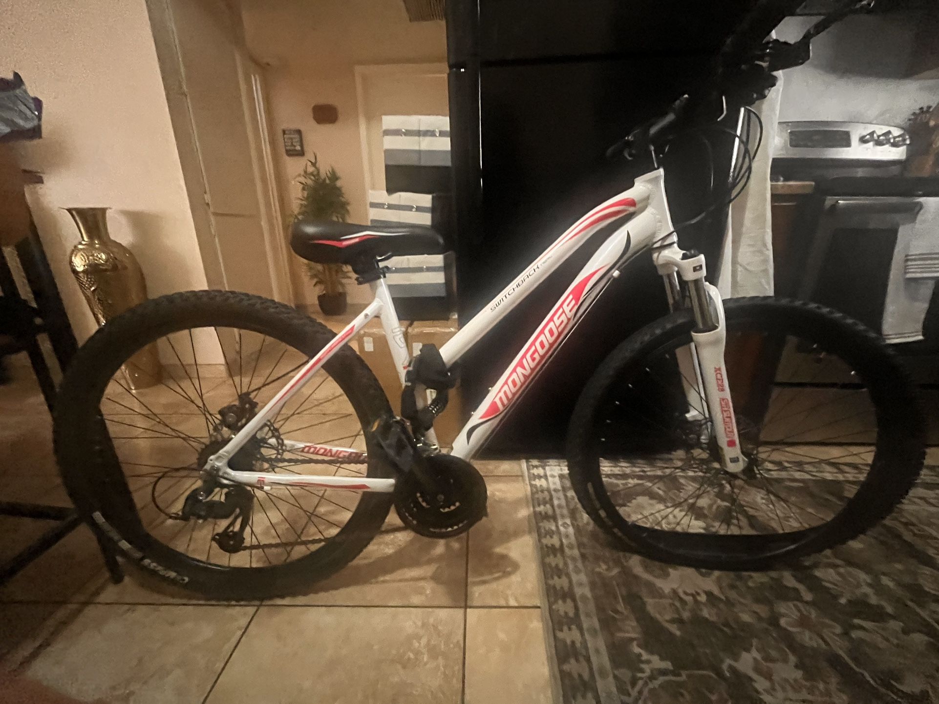 Used Lightly Mongoose Mountain Bike Switchblade Pink And White Color Way no problem only thing you need is a need tube cause it has a flat tire but there is nothing else wrong with the bike.
