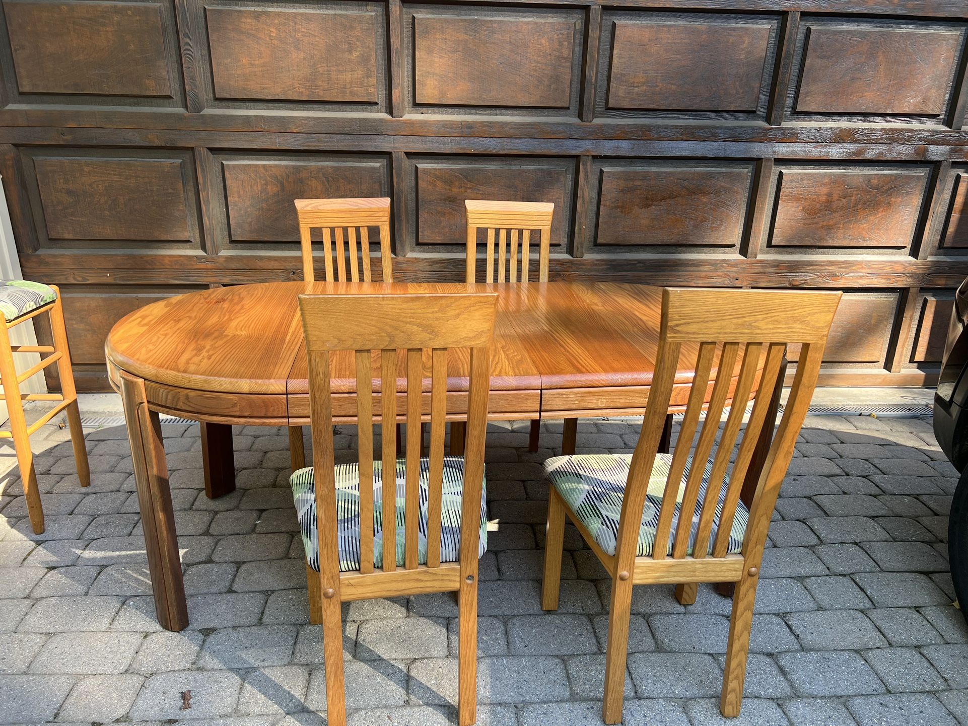 Good quality table from Keller. Every bit of this table is solid oak. Beautiful finish. 42 inch round plus three 12 inch leafs to extend the table to accommodate a larger gathering. Great to have for upcoming holidays! 4 dining chairs and 2 matching counter stools. Can be used in kitchen or dining room Well cared for in a Smoke-free, pet-free home