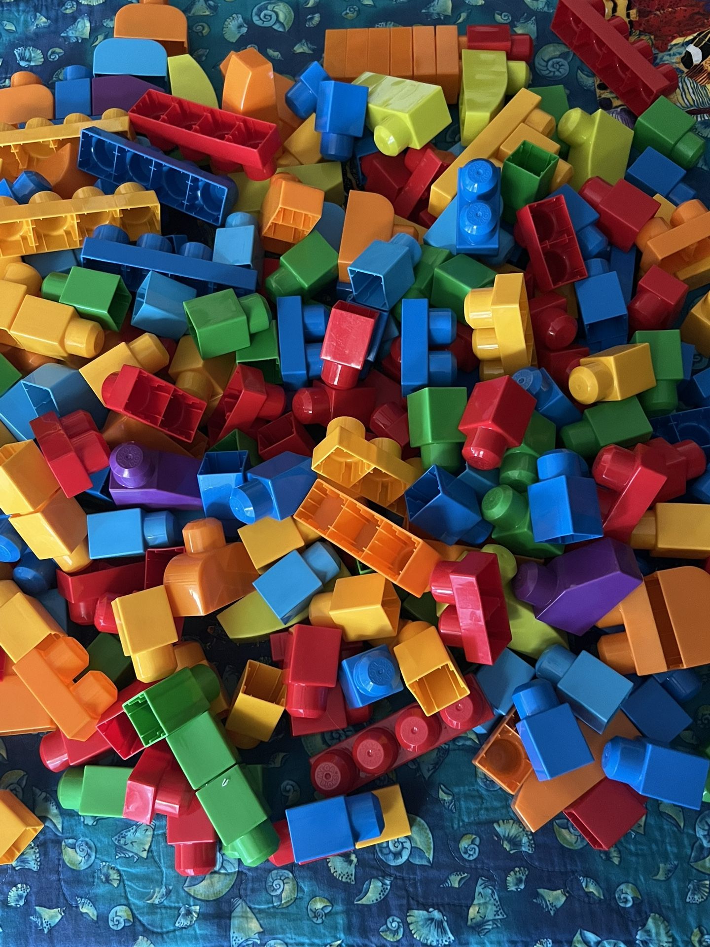 A fabric bin full of chunky, colorful, plastic building blocks for kids of all ages. Well cared for & clean. Bin size is 16x10x14”