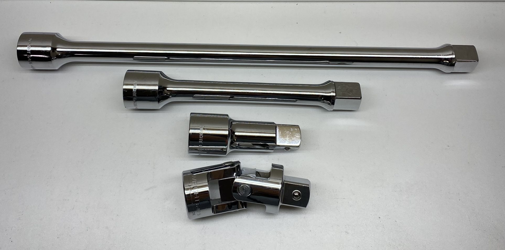 New Wright 4 pc. 3/4 Drive Socket Extensions Size: 16” , 8” , 4” extensions and 4” universal joint. Built-in spring tension for easy application to nut. No binding or locked joints or sharp corners. Chrome moly steel. • Forged and Machined for Best Fit and Unyielding Strength • Precision Heat-Treated and tempered for optimal hardness, ductility and durability • Easy to read stamp pattern in order to quickly determine opening size • Made in the USA. Designed, Engineered and Manufactured in Barberton, OH • Meets and exceeds ASME B107 hand tool standards 2 Sets Available