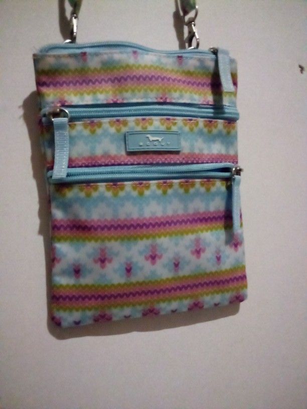 This authentic Scout crossbody is super cute and clean. Easy cleaning exterior. Silver tone hardware and lobster clasps. This matches everything it has pink,baby blue, purple, green and white. Baby blue zippers. Lots of compartments. Will hold all your essentials! Perfect summer must have!!