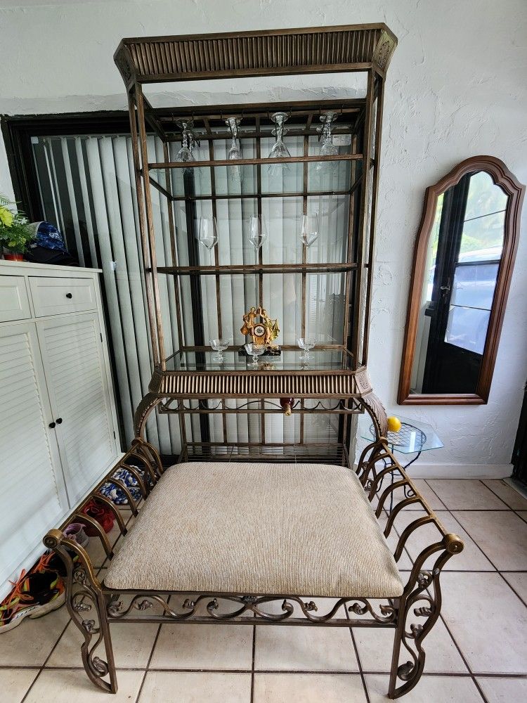 Beautiful metal and glass bar shelving unit with matching bench and small accent table. Complete set in Tuscan / Mediterranean style with decorative ironwork. The bar shelf features: Multiple glass shelves Built-in wine bottle rack Hanging rack for wine glasses Matching bench includes a clean cushioned seat and solid metal frame. Small accent table is also included β perfect for decor, drinks, or plants. All pieces are in excellent condition β clean, sturdy, and ready to use. Perfect for: Home bar setup π· Kitchen or dining area Entryway bench + storage Stylish decorative setup Selling as a complete set.
