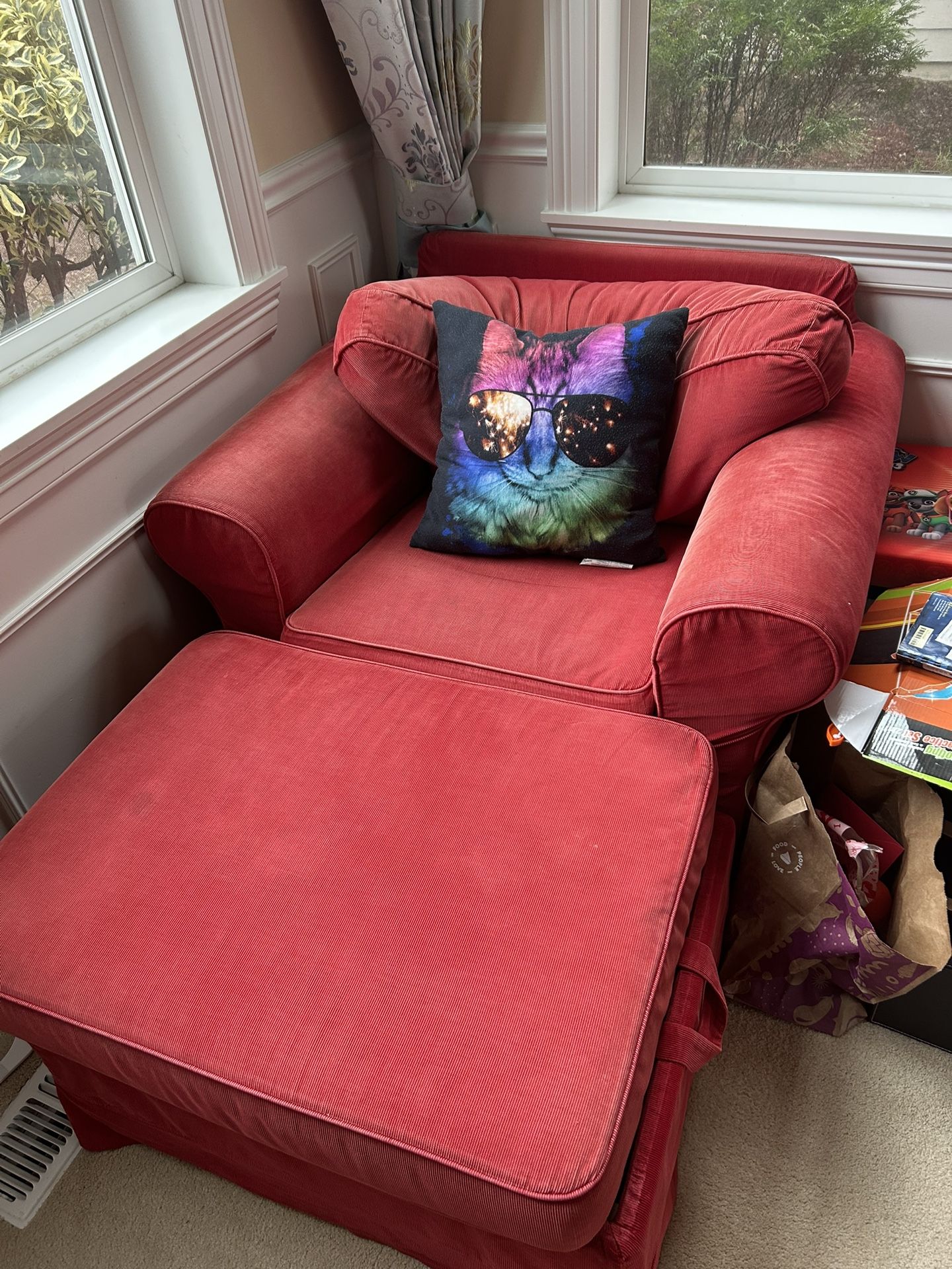 red sofa chair with foot rest and storage