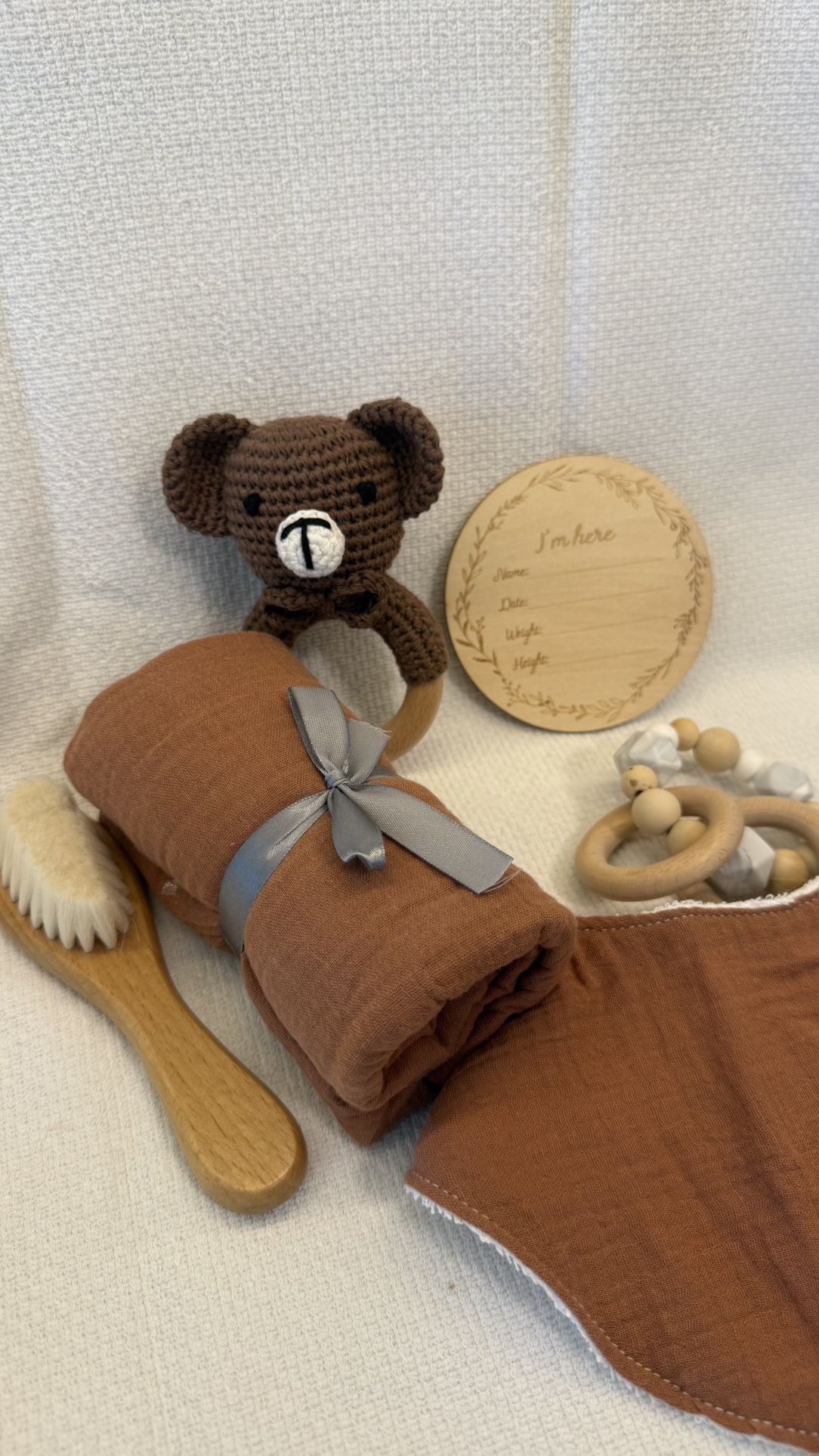 gift box includes everything a newborn needs for comfort and joy: ✔️ Soft muslin bib ✔️ Cozy blanket ✔️ Wooden baby brush ✔️ Handmade teether ✔️ Crochet rattle toy ✔️ “I’m here” wooden birth announcement card Made with natural, baby-safe materials 🌿 Perfect for baby showers, newborn gifts, or a special surprise for new parents. 🎁