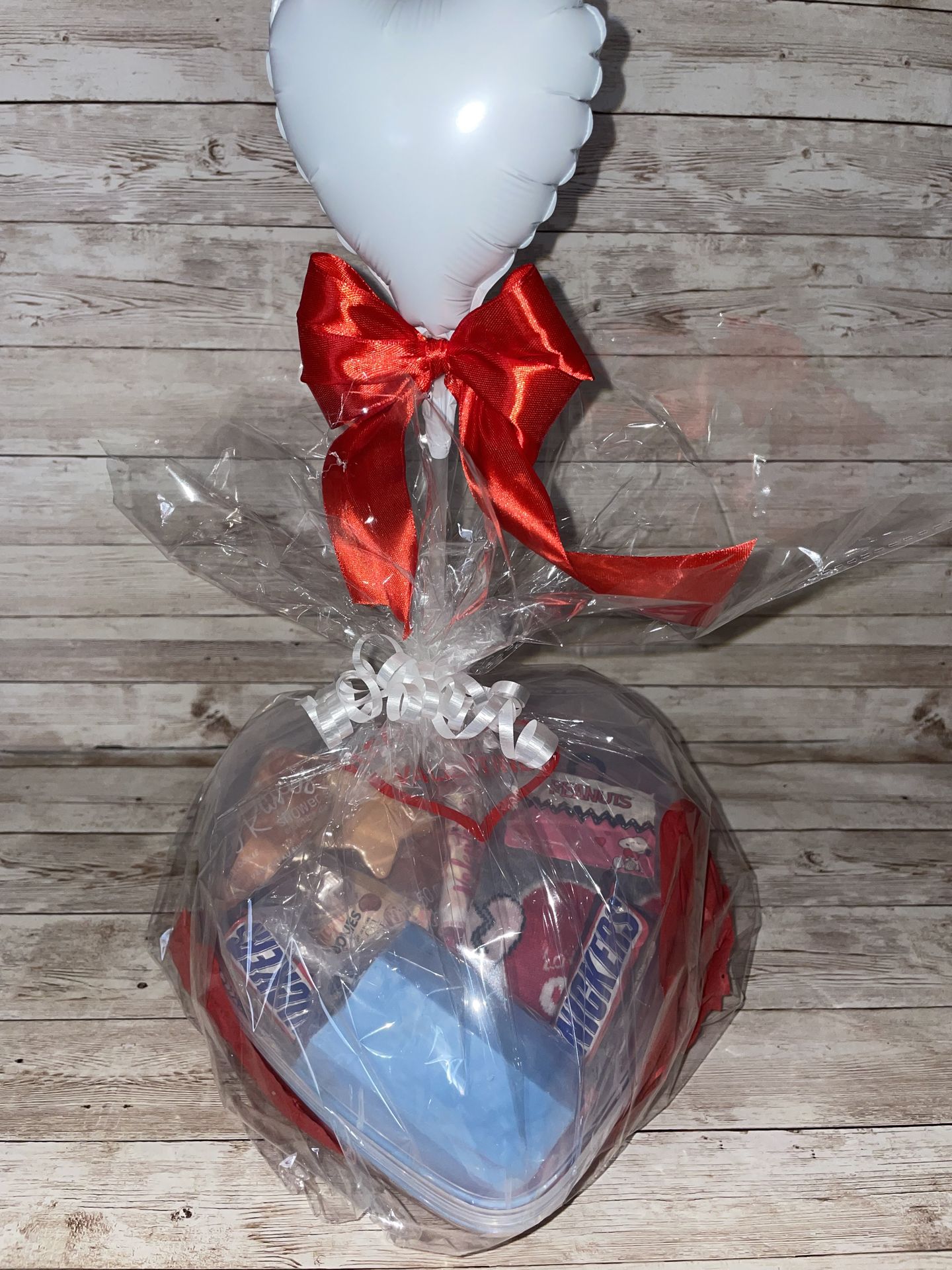 Basket Contains sented candle, socks, balloon , heart cake, candy etc.
