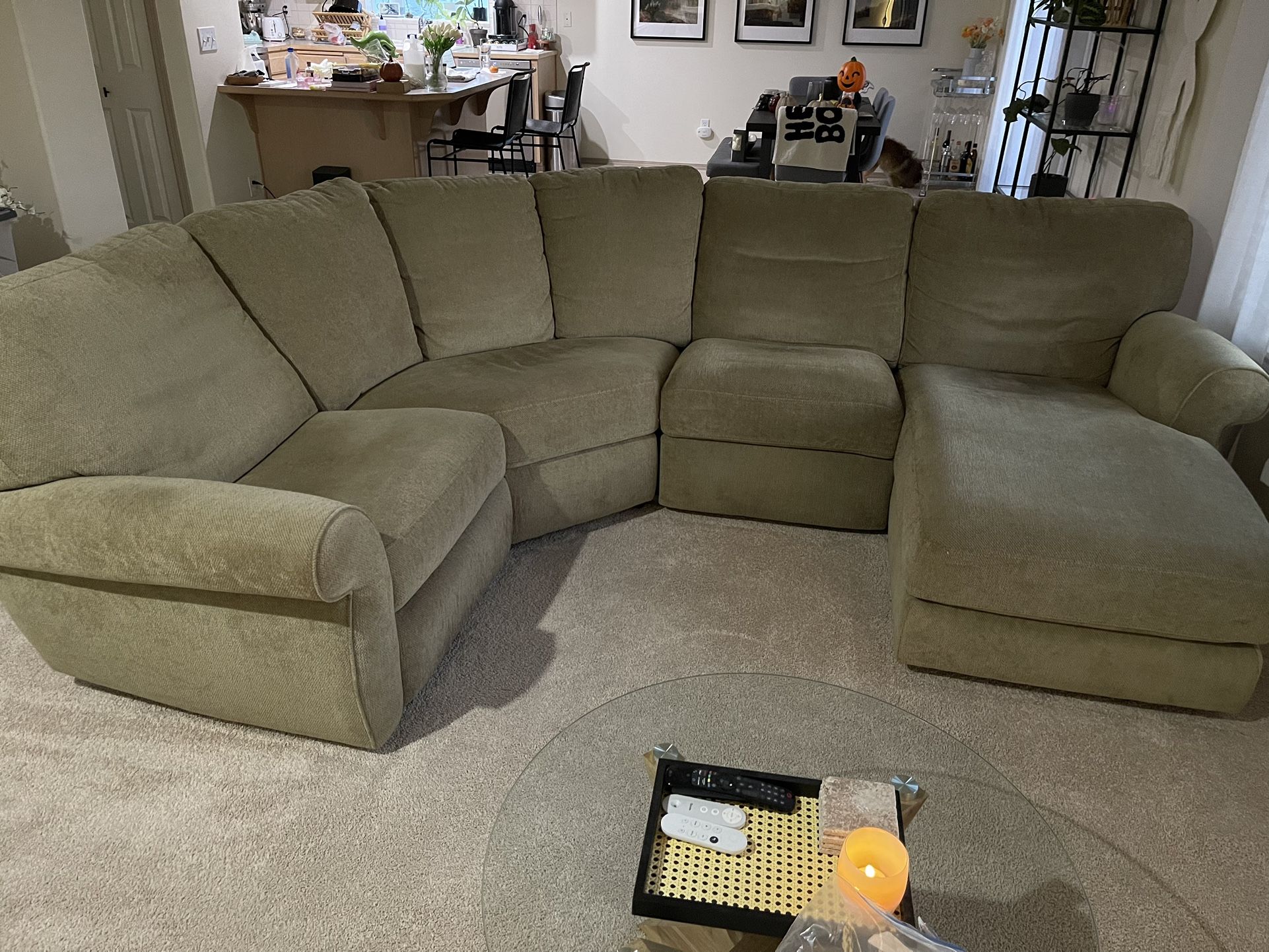 Free 4 piece sectional, one reclining chair, one chaise, one has reclining function but doesnt work and a corner piece. Want it gone in next few days, if not it’s going to the dump. You haul. Has been shampooed recently and comes from a clean pet friendly home