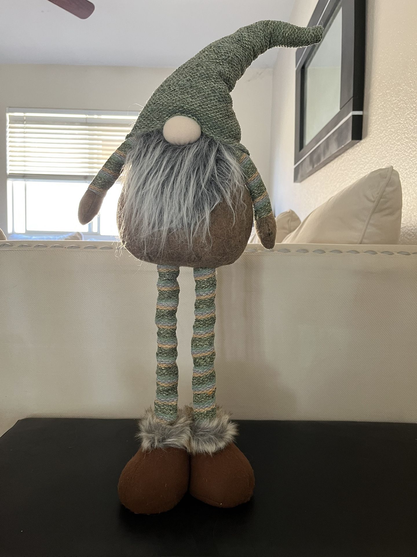 EXTENDABLE GNOME - Plush gnome has adjustable legs with springs inside - Inside the hat is an adjustable wire allowing you to position it to your liking - Shortest Height: 22” - Tallest Height: 31” Selling Price: $15.00