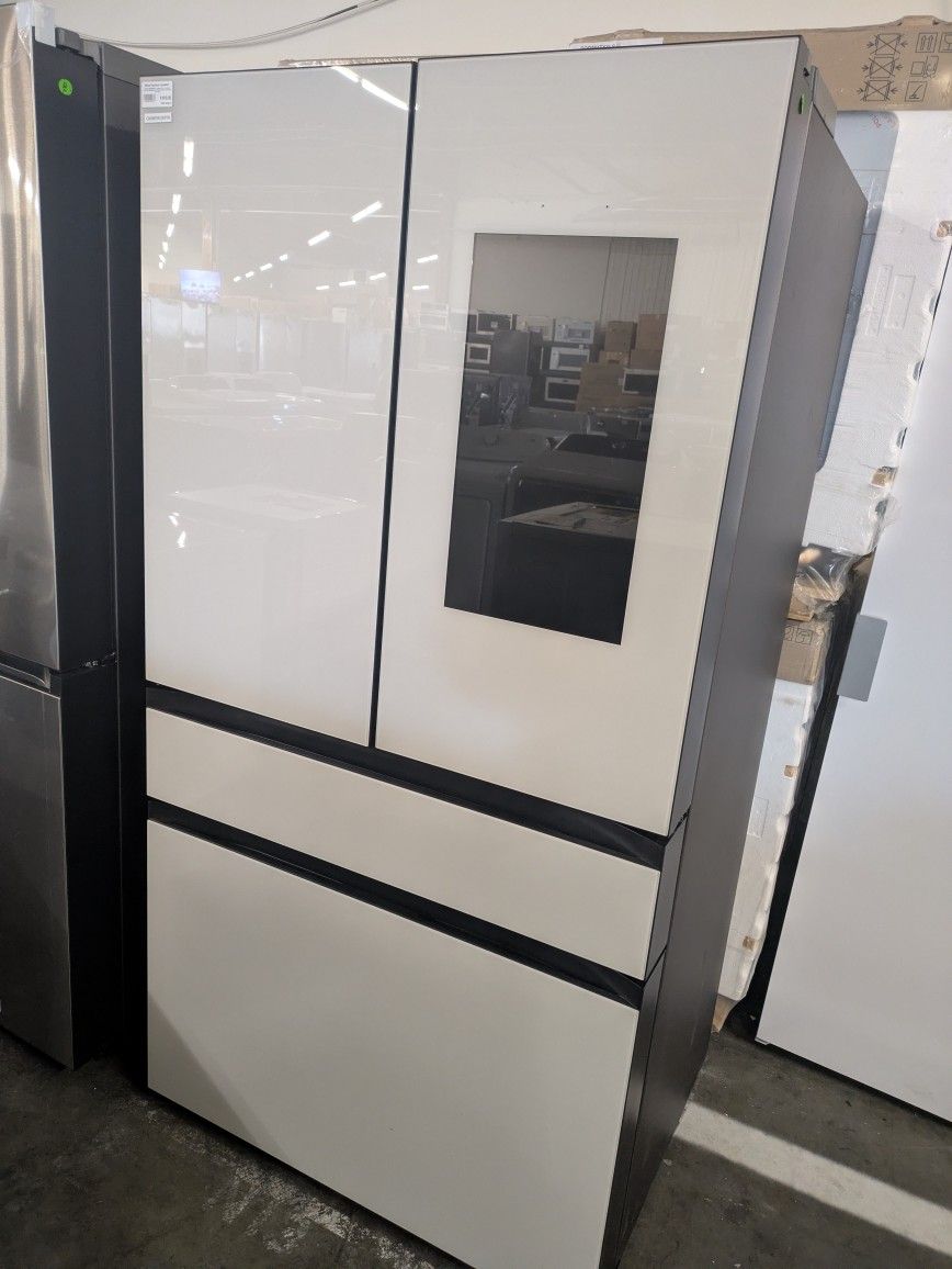 Samsung BESPOKE RF23BB890012 36 Inch Counter-Depth Smart 4-Door French Door Refrigerator with 23 cu. ft. Capacity, 4 Shelves, Gallon Bin, FlexZone, Family Hub, Beverage Center, Dual Ice Maker, and ENERGY STAR®: White Glass National Appliance Liquidators Contact Lino